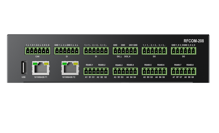 RFCOM-208 economic 4G industrial gateway is a multi-interface, high-performance RS485/CAN/DIDO communication management terminal designed for industrial control environments. It is equipped with an ARM A7 processor with a main frequency of up to 798Mhz and adopts a fanless and silent design, suitable for complex industrial environment applications.